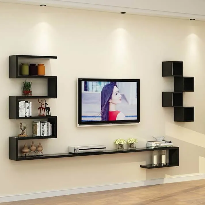 Những mẫu kệ tivi treo tường cách điệu có thể trưng bày đồ dùng trang trí hoặc loa đài âm ly đầy đủ cho người dùng tiện nghi sử dụng thậm chí có thể mở rộng hơn cho không gian thay vì các món đồ nội thật lộn xộn khác nhờ lắp đặt ốp tường có bề dày chỉ 20 – 30 cm, kích thước nhỏ gọn và có nhiều ngăn chứa đồ dùng rất tiện ích.