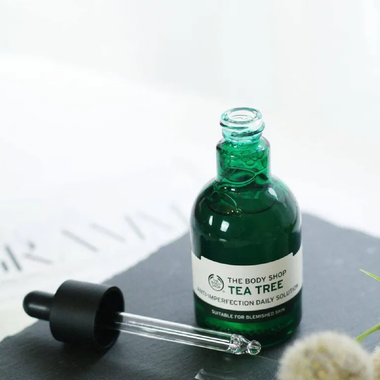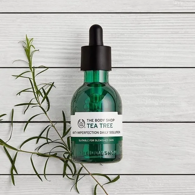 Tinh chất trị mụn The Body Shop Tea Tree Anti-Imperfection Daily Solution được đựng trong một chai thủy tinh màu xanh