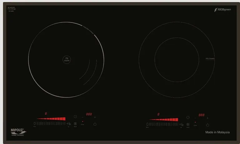 Dòng bếp từ NAPOLIZ NA 599IC với 2 vùng nấu phù hợp với nhu cầu của khá nhiều gia đình, mặt kính shott ceran nguyên khối vát cạnh đầy thời trang, màn hình điều khiển bằng cảm ứng điện từ mang tới cho căn bếp sự sang trọng