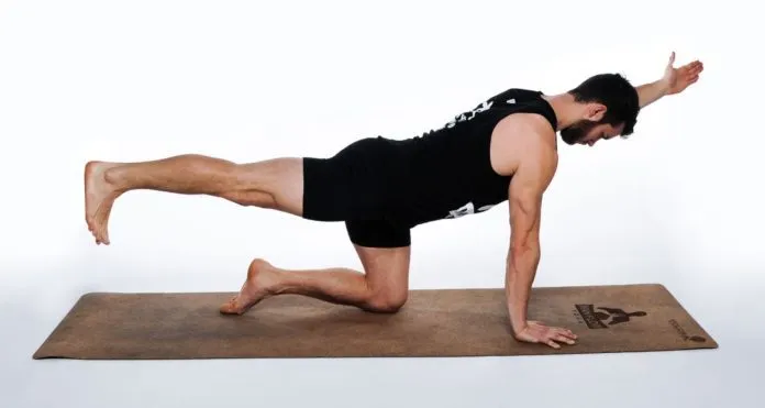 - Bước 2: Giơ tay trái về trước đồng thời duỗi chân phải thẳng về sau sao cho cả chân và tay đều song song mặt sàn.