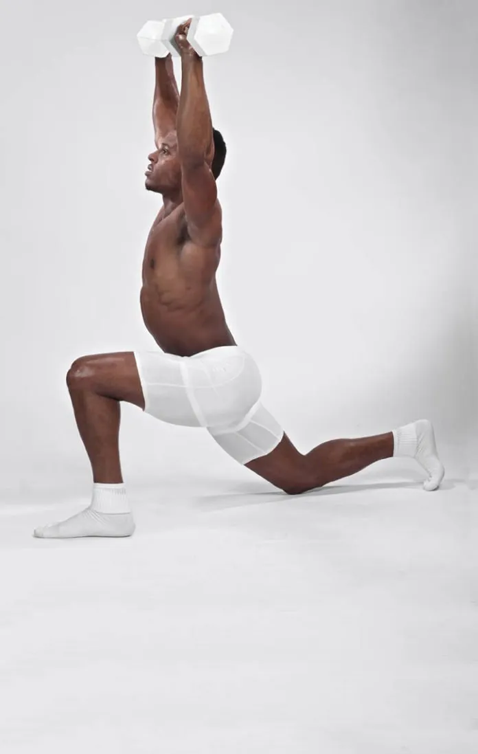 - Bước 2: Bước xa chân trái về trước sao cho cẳng chân phải ở phía sau song song mặt đất, đồng thời hai tay vẫn trong tư thế giữ tạ cao qua đầu.